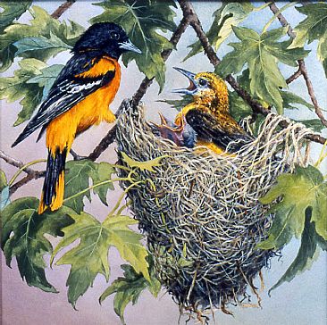 Another sociable bird is the oriole, she often hangs her pretty cradle on the end of an apple-bough. Sometimes you may find one of these wonderful hanging nests three or four feet long, sometimes only about seven inches, and nearly as wide. At the bottom of it you will find four spotted eggs, blue, if it is an orchard oriole; pink, if it is a Baltimore oriole's nest. This nest is most elaborately woven into a fabric like a plaited straw hat. A gentleman counted the stitches which an oriole had made with one long wisp of hay, and found that it had passed through thirty-four times. A lady suggested that the bird might be taught to darn stockings.