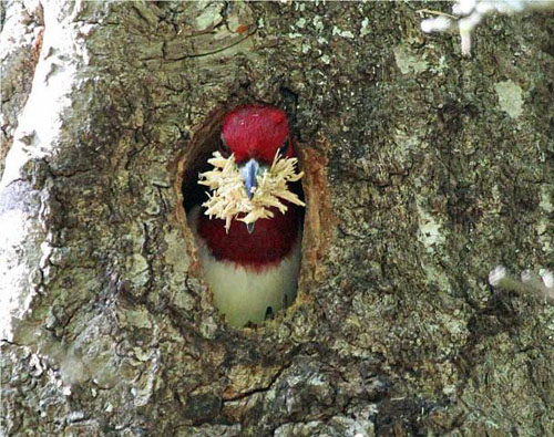 The woodpecker's nest is ingeniously built. She sounds her hammer along the limb of a tree till she finds one that betrays decay then she bores a hole down deep into the heart of the bough, and lays her four pure white eggs on the dust at the bottom.