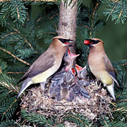 The cedar bird is quite pretty; the upper part of the body is fawn-colored, and the breast is yellow. The wings are slaty-blue, as is also the tail, 'which deepens into black.. The tips of the tail-feathers are bright yellow. On the head is a long, pointed crest, that can be raised up nearly perpendicular. On the shorter wing-feathers are usually found wax-like tips, which are simply extensions of the shaft. These are shown quite plainly on the wing of the lower bird in the picture.