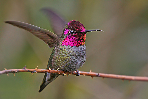 Although blossoms of every kind attract the humming-bird, yet tubular flowers are its greatest favorites, because of the insects which crowd the recesses of the blossom to feed upon its sweets. Arriving at a thicket of them, the little creature suspends its body on the wing so steadily that its pinions become almost invisible. Its only note is a single chirp not louder than that of a cricket or grasshopper.