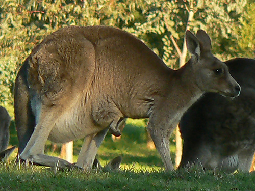 The baby kangaroo is born in about 31-36 days and crawls into the pouch and then holds onto its mother for sucking its milk, it is only the size of a lima bean and then stays there for about 9 months but will still be fed by mother until 18 months old. On an average the kangaroo will live about 6 years. A normal hopping speed for kangaroos is 16 miles an hour but they can go for a mile at 25 miles an hour. They like to eat in the cool of the evening feasting on the grass and shrubs and then keep on chewing the cud like a cow.