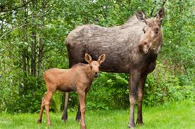 The Northern countries of Canada and Siberia are where the moose lives mostly but they use to be more scattered in the south but all the hunting of them for food and leather cut down the population. Moose are the largest of the deer family and are the only deer that can eat under water. He likes the aquatic plants to eat, where he can be in the water and escape the flies that are so plentiful that like to bother him. And he will eat the leaves of the birch, stripping them off in bunches from the branches as well as other willows, plants and trees. He has some good teeth but the top front teeth are missing and he has a tough tongue and upper lip that helps him get hold of the tough foliage and woody vegetation. He will eat about 71 pounds of food a day. He likes to live alone except during mating season when he will fight hard with his antlers to have his choice of a mate and sometimes he will pick more than one. It takes about eight months befor the bay is born. But he does not take care of his baby and leaves all the work for mommy to care for one or sometime twin babies.