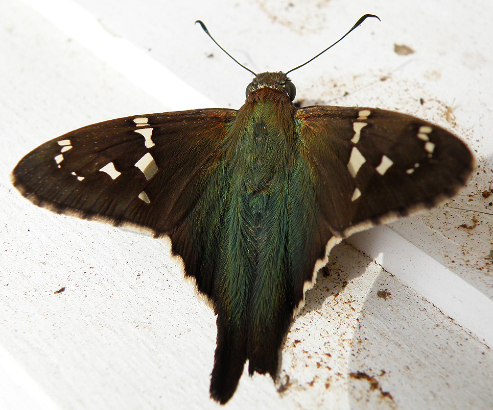 The upper wings have an acute lengthened apex, which is exactly the shape of the tip of the leaf of many tropical trees and shrubs; while the hind wings are produced into a short, narrow tail, which well represents the stalk of a leaf. It always settles on an upright twig or branch, holding on by its forelegs, while its body, concealed between the lower margin of the wings, rests against the stem which the extremity of the tail, representing the stalk, just touches.