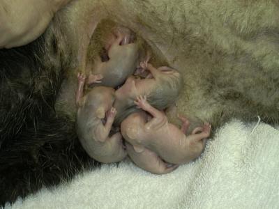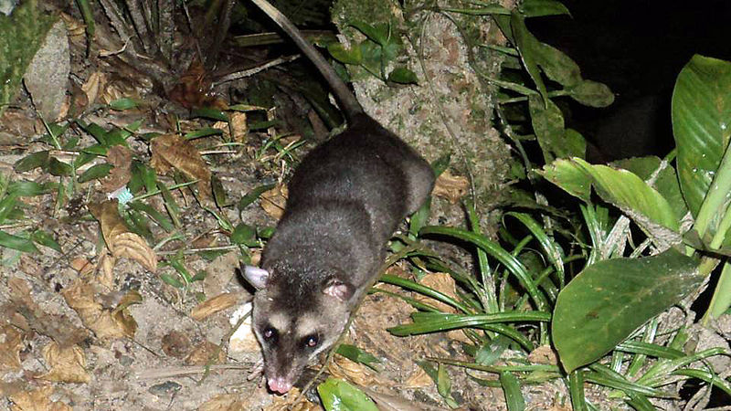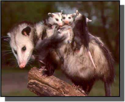 This animal is the only marsupial that lives in America as well as Australia and carries the babies in a pouch. The mother has thirteen nipples, twelve in a circle and one in the center. The parent will use his tail for support as if it were another foot. She will sometimes carry her babies on her back and they can curl their tails about hers as she climbs and hunts for food.
